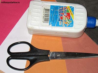 Приготовим исходные материалы: коричневую бумагу двух оттенков, розовую, белую и черную бумаги, клей ПВА и ножницы.