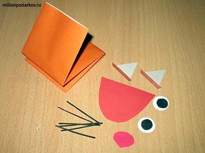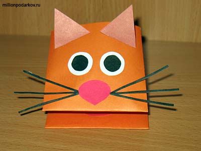 Коричневую бумагу более светлого оттенка сгибаем через весь лист на три части, затем склеиваем их так, чтобы оказалась одна полая полоска. Полученную полоску сгибаем на на три части как показано на фото, получиться полоска, состоящая из 4 квадратов. Вырезаем из бумаги глаза, нос, язык, уши и усы котику.