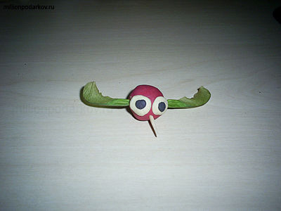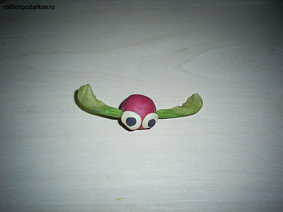 Скатываем из пластилина шарик. Две половинки семя клена вставляем по бокам шарика. Из белого пластилина делаем глазки, а из черного зрачки.
