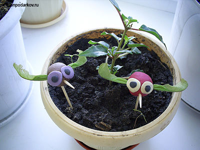 Таким же образом делаем еще одну мушку, но другого цвета. Вставляем снизу зубочистку. Поместим наших мушек в цветочный вазон. Они отлично украсят ваш подоконник и даже станут забавными символами-талисманами. В итоге детское творчество, поделки сделанные руками детей превращаются в замечательное украшение и отличный сюрприз, которым можно порадовать маму, папу, бабушку или дедушку.