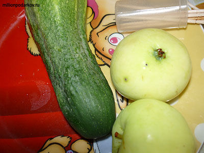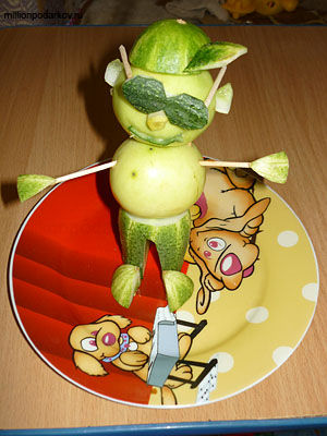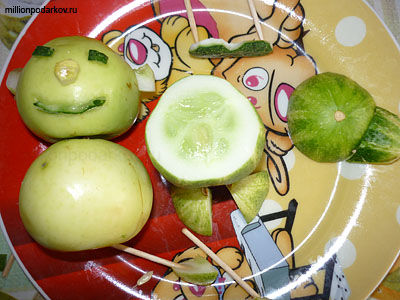 Для домашнего творчества поделки из овощей и фруктов приготовьте, яблоки и огурцы. Так же вам потребуются зубочистки, нож и разделочная доска.