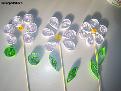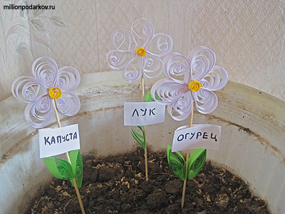 Домашние поделки для огорода сделают вашу поездку на дачу веселее и ярче. В первые дни весны, когда земля еще не радует наз буйным цветением и урожаем, а только лишь готовится - украсьте огород яркими цветами в технике квиллинг. На цветах сделайте ярлычки и расставьте такие указатели на участке, где вы будете высаживать овощи и зелень.