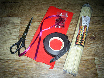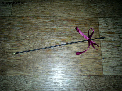 Берем бамбуковое шампура и обматываем его флористической лентой. Завязываем атласный бантик.