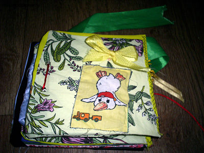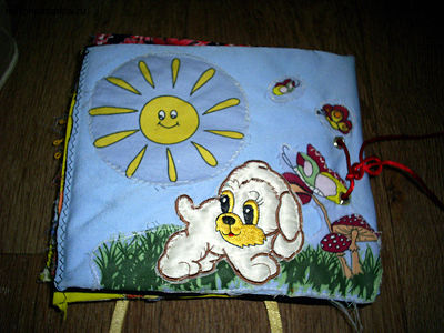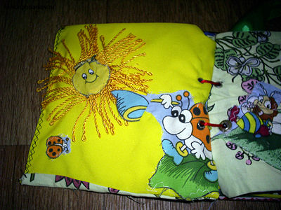 Хочу привести в качестве примера самодельной развивающей игрушки книжку, сделанную собственноручно. Этой книжкой можно играться с трех месяцев. Все страницы шились из квадратов ткани, которые соединялись с трех сторон, выворачивались наизнанку. Затем вставлялся картон, и сшивалась третья сторона. Вот первая страничка. Здесь пришита вырезка из ткани детской расцветки и ленточка, завязанная бантиком. Под вырезкой находятся кусочки плотной фольги. Поэтому если ее потрогать, то будет ощущаться шуршание.