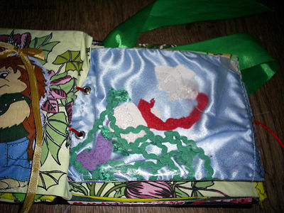 На этой страничке тоже пришита вырезка из ткани, которая изнутри набита ватой. Сверху прикреплена маленькая ленточка.