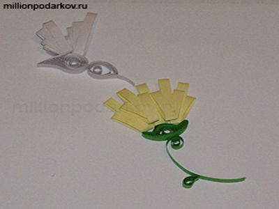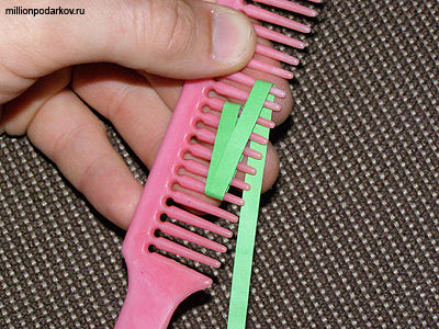 Берем бумагу для квиллинга, наматываем ее на зубчики расчески, формируя нужный узор (как показано на фото), закрепляем с помощью клея.