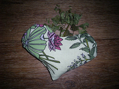 Выворачиваем поделку и наполняем ее травами. В нашем случае мы использовали мяту. Для наполнения можно воспользоваться лейкой. Так работа пойдет быстрее.