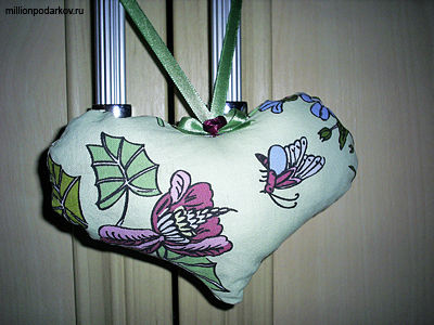 Зашиваем отверстие. Делаем из бардовой атласной ленточки сердечко, а из зеленой – бантик. Пришиваем бантик и розочку к саше. Делаем петельку из зеленой ленточки. Получилось вот такое замечательное ароматное саше. Использовать его можно, повесив в шкафу, положив под подушку или просто украсив вашу комнату. В зависимости от наполнения достигается различный эффект. Так, мята дезинфицирует и освежает воздух, помогает обострить память, способствует активизации умственной и физической деятельности. В саше также можно добавлять эфирные масла.