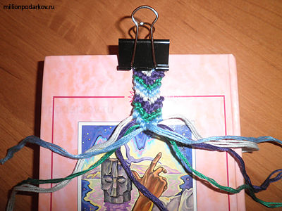 Для начала работы склдываем пополам нити и завязываем узелок. Потом закрепляем этот узелок к книге с помощью зажима и начинаем ведущей нитью обвязывать другие нити.
