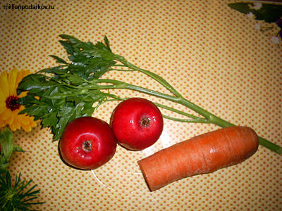 Для поделки нам понадобится петрушка, морковка, два яблока.