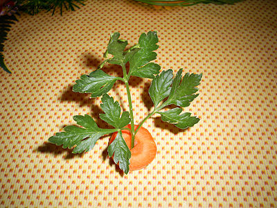 Из кусочка морковки и петрушки делаем дерево. Для этого в морковке делаем отверстие крест накрест и крепим там веточку зелени.