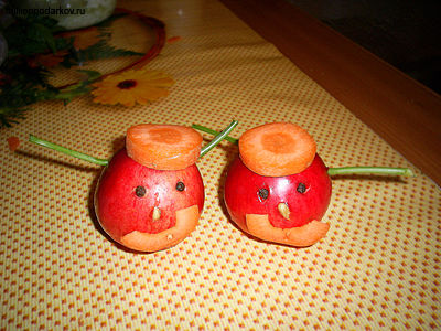 Из яблок делаем влюбленную парочку. Для этого нам понадобится петрушка, две косточки лимона, морковка и перец горошком. Из петрушки делаем ручки и вставляем их в яблоко. Отрезаем два кружечка морковки и делаем из них шапочки. Вставляем нос – косточку, глаза – перец. Из половинки кружечка морковки вырезаем ротик. Прикрепляем его к яблоку с помощью зубочистки. В итоге у нас получаются два забавных человечка.