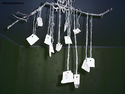 В получившиеся конвертики можно положить записочки с заветными желаниями или наполнить их засушенными цветами, кусочками мха. Теперь осталось лишь повесить нашу поделку на двери или возле окна. От малейшего движения воздуха квадратики будут двигаться, стучать друг об друга и издавать приятный мелодичный звон.