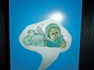 Из цветного картона голубого цвета делаем заготовку открытки. Для этого лист картона просто складываем пополам. Из белой бумаги вырезаем фигуру облачка. Красками нарисуем на нем младенца с крылышками. Клеем ПВА или пальчиковым клеем приклеим вырезку к открытке.
