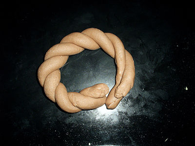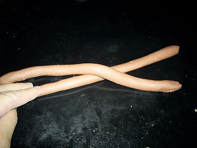 Катаем две тонкие и длинные колбаски и начинаем сплетать из них косичку.