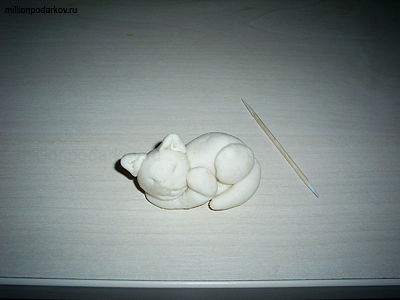 Слепим котика из белого пластилина. Стеком или зубочисткой выделим детали мордочки. Оставляем изделие сохнуть при комнатной температуре, пока оно не станет твердым.
