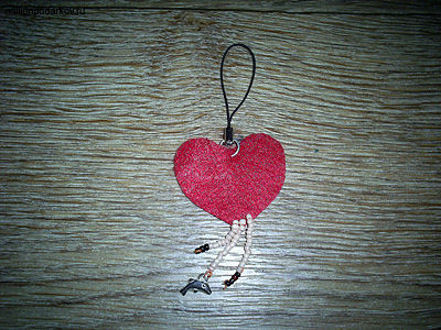 Теперь декорируем подвеску, прикрепив снизу три ниточки с бисером. Для этого вначале закрепите ниточки, сделав узелки на обратной стороне брелка, затем нанижите бисер. На одну из ниточек прикрепите дельфина. Можно использовать самый разнообразный бисер и различные декоративные элементы. Теперь Вы знаете, как сделать ручную поделку на день Валентина из любой бумаги.
