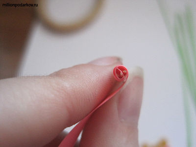 Край зубочистки расщепите до середины. Закрепите о щели край полоски бумаги и вращательными движениями скатывайте рулончик. Снимите с зубочистки и приклейте свободный конец к рулончику.
