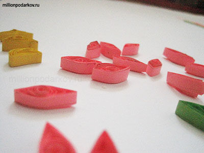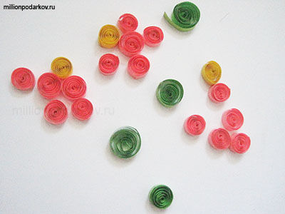 Сжимая пальцами края заготовок, формируйте нужные элементы. Для того, чтобы поделка была более воздушной ,рулончики не сворачивайте туго – пусть они будут свободными.