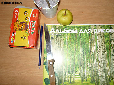 Для поделки вам потребуется лист альбомной бумаги, карандаш, краски (лучше гуашь), кисть, стакан с водой, яблоко и нож.