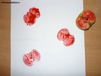 Разрезаем яблоко пополам. Половинку яблока мажем гуашью. Затем просим ребенка сделать яблоком несколько отпечатков.