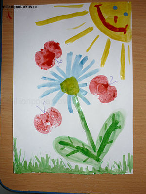 Когда отпечатки сделаны, рисуем карандашом нашим бабочкам усики. Затем дорисовываем картинку. Рисуем вместе с ребенком цветочек, солнышко, травку. Картинка-поделка для детей "Бабочки и цветок" готова!