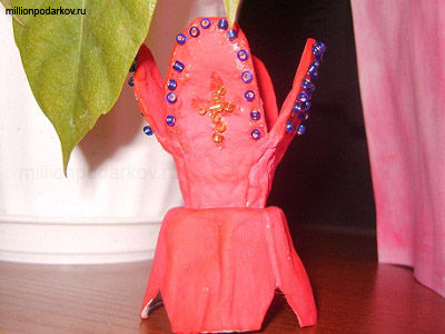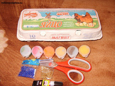 Для изготовления этой картонной поделки нам в первую очередь понадобится коробка для яиц. Также нам нужны будут клей, бисер, краски и ножницы.