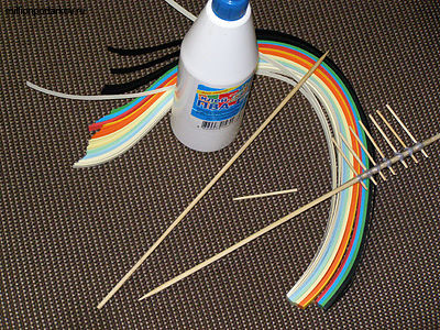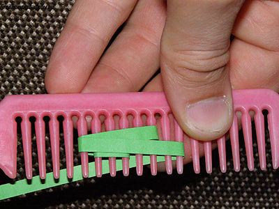 Берем бумагу для квиллинга, наматываем ее на зубчики расчески, формируя нужный узор (как показано на фото), закрепляем с помощью клея.