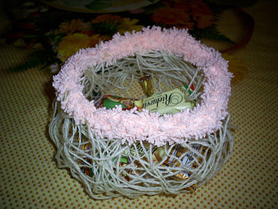 Теперь вверху обяжите поделку крючком столбиком без накида. Получается замечательная креативная вазочка, в которую можно положить конфеты и печенье. Такие креативные поделки сделают обстановку в вашем доме еще интереснее и оригинальнее.