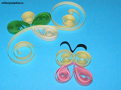 Берем бумагу для квиллингу закручиваем на иголочку (я накручивала на зубочистку), после чего распускаем заготовку и формируем нужный узор.