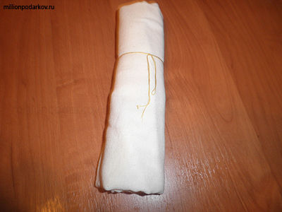 Для этого нужно аккуратно скатать белую ткань и завязать ниточкой так, чтобы отделить голову от тела. Узелок будет символизировать пуповину.