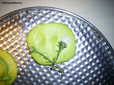Цветочками или растениями делаем тиснение. Зубочисткой делаем два отверстия.