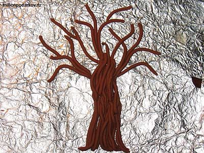 Через чеснокодавилку продавливаем тесто и из полученных полосочек выкладываем ствол яблоньки в произвольном порядке. Затем налепливаем ветки.
