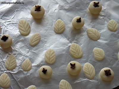 Отдельно лепим яблоки, для серединки используем пряность гвоздику. Листочки лепим произвольной формы и размера, наносим рисунок стеком. Изделия высушить, тогда они не будут прогинаться на ветках.