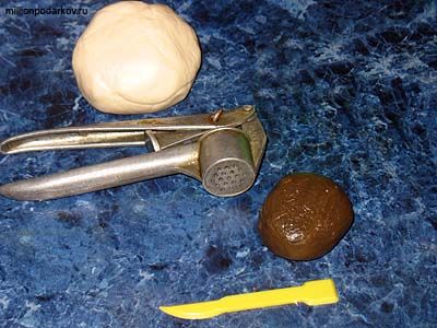 Из муки соли и воды замесить соленое тесто. Часть теста окрасить в коричневый цвет с помощью гуаши. Также мы будем пользоваться чеснокодавилкой и стеками. Детали изделия будем склеивать клеем ПВА.