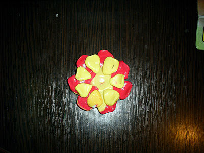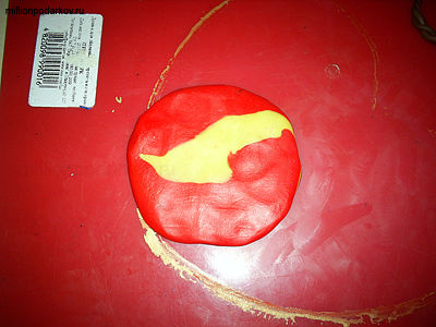 Смешиваем два цвета пластики, например красный и желтый. Катаем шарик и сплющиваем его.