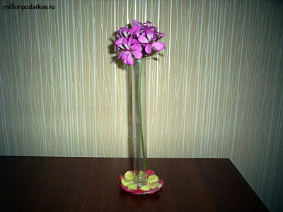 Нам осталось лишь с помощью клеящего термопистолета прикрепить пробирку к цветку. Вот и готова наша замечательная вазочка. Теперь в нее можно налить воды и поставить цветочек. Так лепка из пластики, поделки из подручных материалов превращаются во что-то полезное и оригинальное.
