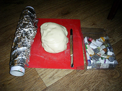 Для того чтобы сделать поделку, нам понадобятся такие материалы, как соленое тесто, акриловые, акварельные или гуашевые краски, кисточка, стек, фольга и лак. Соленое тесто мы будем делать из муки, соли и воды. Смешаем их в пропорции 3:2:1. Замешиваем тесто. Оно должно получиться упругим. Если будет липнуть к рукам – добавьте еще муки, если будет крошиться – воды. Хорошо вымешиваем тесто и кладем его в холодильник на пару часов. Это сделает его более удобным в работе.