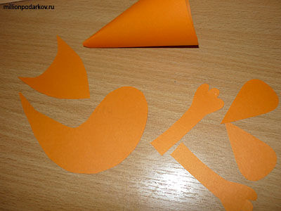 Вырезаем из бумаги детали для поделки. Это хвост, лапы, голова и полукруг для конуса. Из полукруга склеиваем конус.