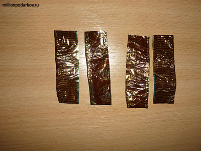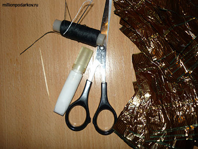 Когда набралось нужное количество скрученных в трубочки фантиков, начинаем их собирать на нитку.