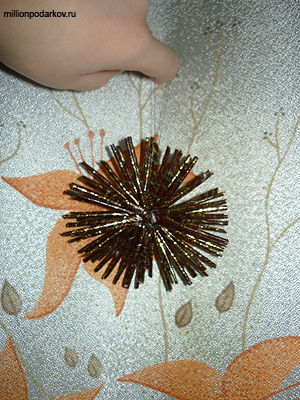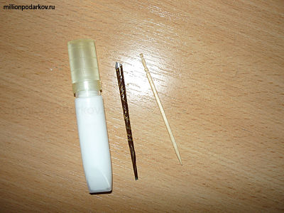 Аккуратно накручиваем на зубочистку фантик, так чтобы получилась тоненькая трубочка. Затем на кончик трубочки капаем каплю клея ПВА.