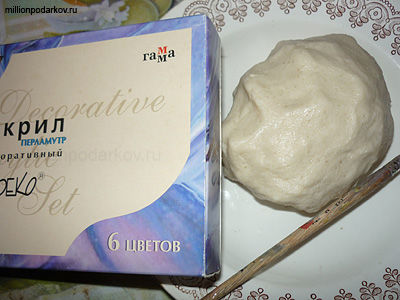 Для поделки из теста "Рамка для фотографии" нам потребуется готовое соленое тесто. Делается оно очень просто. Смешиваем муку, соль мелкого помола и воду, и замешиваем крутое тесто. Тесто ставим в холодильник на пару часов, а после этого лепим. Кроме теста нам еще понадобятся краски, кисточка и стакан с водой. Краски могут быть, как акрил так и гуашь. Но если вы покрываете изделие гуашью, то потом следует его покрыть лаком, чтобы цвет изделия не испортился.