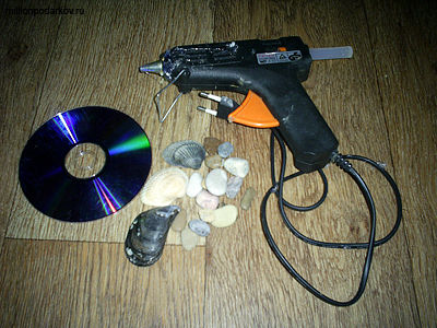 Итак, для изготовления поделки приготовьте такие материалы, как морские ракушки, морские камни, сухоцветы, горячий силиконовый клей и диск.