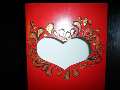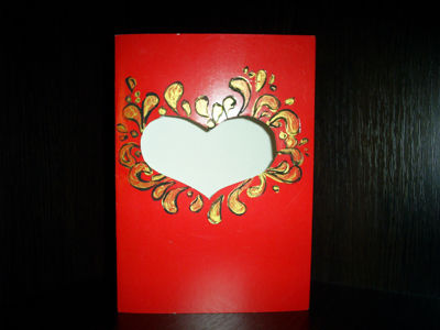 Складываем лист красного картона пополам. В итоге у нас получается заготовка открытки, уже из которого в дальнейшем мы можем сделать красивую поделку. Вырезаем в шаблоне сердце. Для этого заранее нарисуем его контур простым карандашом и вырежем ножницами или канцелярским ножом. Тонкой кисточкой и черной краской нарисуем вокруг вырезанного сердца орнаментальный рисунок и разукрасим его золотистой краской.