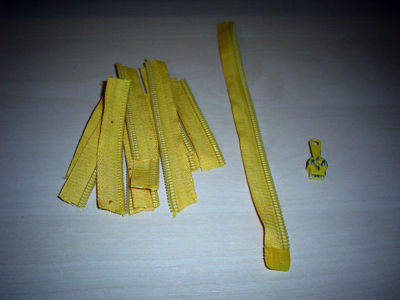 Берем молнию и разделяем ее на две части. Разрезаем одну часть и кусок второй на равные доли. Одну часть оставляем более длинной.