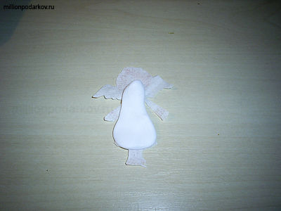 Вырезаем из салфетки ангела и отделяем три слоя. На основе белого слоя делаем основу ангела из пластики. Сверху вклеиваем металлическое колечко. Варим поделку 15 минут.