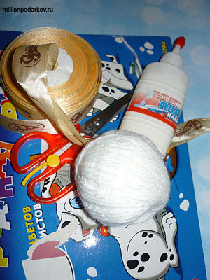 Делаем из атласной ленты бантик, расстригаем нитки для вязания на 5 небольших отрезки по 3 см.