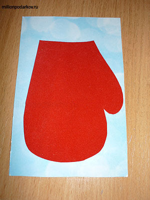 Вырезаем из картона основу для открытки. Из бархатной бумаги вырезаем силуэт рукавицы.