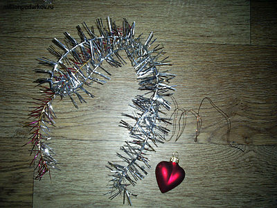 Теперь обмотайте проволоку мишурой. Скрепляйте ее с помощью скотча. Повесьте в середину елочную игрушку. В итоге у нас получится вот такой симпатичный венок, который украсит ваши двери и возвестит окружающим о том, что праздник уже поселился в этой квартире. Если хотите, можете украсить мишуру крошкой от пенопласта или разрисовать ее корректором. Получится подобие выпавшего на ветки ели снега. Также можно дополнить украшение стразами, дождиком контрастного цвета. Теперь ваши гости, подходя к дверям, увидят, что в этом доме царит праздничное веселое настроение.