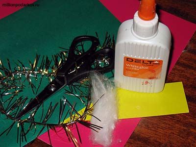 Для работы мы возьмем цветную бумагу, клей ПВА, ножницы, вату, новогоднюю мишуру, веревочку.
